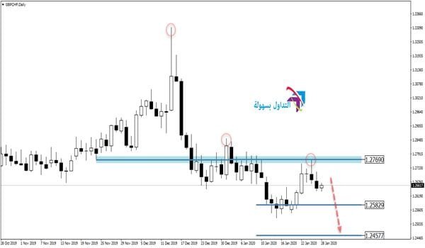وكما ذكرنا سابقا فيعتبر مستوى 1.2769 كمستوى مقاومة للأسعار وتمركز لها ويستهدف الزوج مستويات 1.2582 والتي تعتبر المستهدف الأول له ومستويات 1.2457 والتي تعتبر المستهدف الثاني له وفي حالة كسرت الأسعار مستوى 1.2769 فيعتبر بذلك التحليل لاغيا ولا يعتد به .