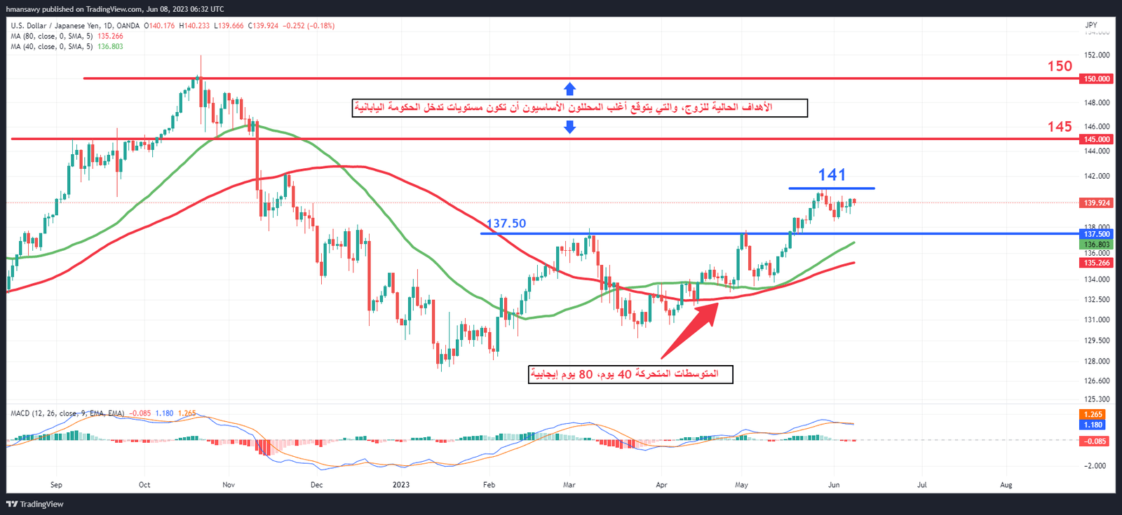 ننصح بشراء زوج (USD/JPY) من الأسعار الحالية (139.82) ليكون مستوي 141 الهدف المرتقب، ويكون أمر وقف الخسارة هو كسر مستوي الدعم 138.75 لأسفل علي الإطار الزمني للأربع ساعات. ونوجه بضرورة أن تكون أحجام العقود معتدلة إلي منخفضة، ويكون تكثيف الشراء مع كسر مستوي 141 لأعلي علي الإطار الزمني اليومي.