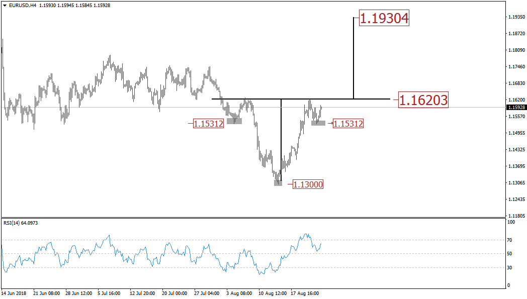 يتم تأكيد الدخول شراء بعد كسر خط العنق عند مستوي مقاومة 1.1620 ووضع اهداف تصل حتي مستوي 1.1930 والذي يمثل مستوي مقاومة للزوج وهدف لنموذج الرأس والكتفين المقلوب .