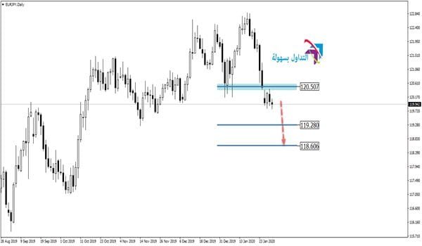 وكما ذكرنا سابقا فيعتبر مستوى 120.50 كمستوى مقاومة للأسعار وتمركز لها ويستهدف الزوج مستويات 119.28 والتي تعتبر المستهدف الأول له ومستويات 118.60والتي تعتبر المستهدف الثاني له وفي حالة كسرت الأسعار مستوى 120.50 فيعتبر بذلك التحليل لاغيا ولا يعتد به .