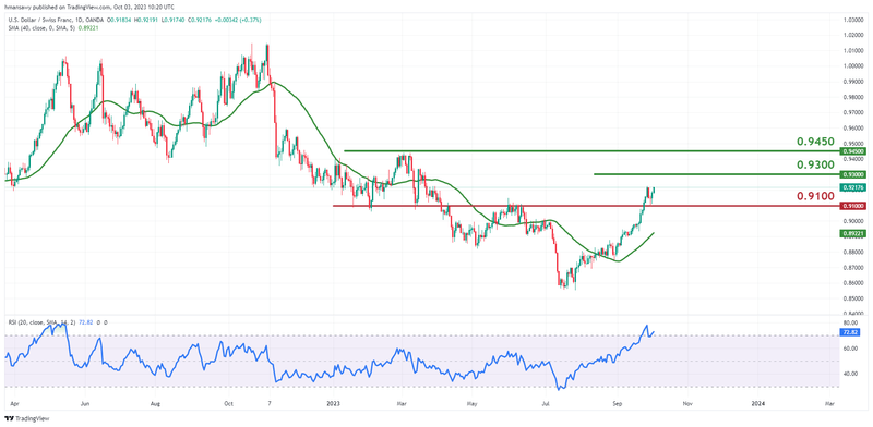 ارتفع الدولار الأمريكي إلى أعلى مستوياته منذ نوفمبر/تشرين الثاني 2022، وذلك بفضل صدور بيانات اقتصادية قوية في الولايات المتحدة تدعم قرار الاحتياطي الفيدرالي لإبقاء أسعار الفائدة عند مستويات مرتفعة لفترة أطول. حيث أظهر مسح صدر يوم الاثنين أن قطاع الصناعات التحويلية الأمريكي اتخذ خطوة أخرى نحو التعافي في سبتمبر/أيلول مع ارتفاع الإنتاج وانتعاش التوظيف، كما أظهر انخفاضا كبيرا في الأسعار التي دفعتها المصانع للحصول على المدخلات. وقد دعم ذلك الدولار بقوة. وأدى إلى تعزيز زخم زوج الدولار فرنك في اليوم السابق وزيادة فرص صعود الزوج على المدى القريب.
