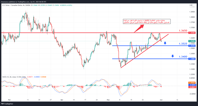 يتمتع مستوي المقاومة 1.3650 بأسباب فنية كثيرة تعزز من قوته كمستوي مقاومة علي الأطر الزمنية أقل من اليوم الواحد، ونجح هذا المستوي في إيقاف نشاط المشترين لمرتين متتاليتين يومي 25 و 31 مايو/آيار مما يعني أن هناك إرتكاز قوي لثيران الكندي.