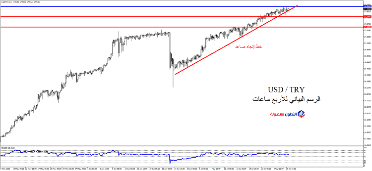 الزوج لا يزال في إتجاه صاعد قوي، وتحاول الأسعار الآن إختراق مستوي 18 لأعلي. يمكننا شراء الزوج من الأسعار الحالية (17.94) ليكون مستوي 18 أول هدف، وإغلاق شمعة أربع ساعات أعلي مستوي 18 إشارة لتعزيز صفقات شراء الزوج ليكون مستوي 18.25 الهدف التالي.