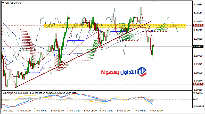 تتغير الرؤية البيعية علي الباوند دولار في حالة تمكن الأسعار من اختراق 1.2030 والاغلاق الإيجابي اعلي تلك المستوي يلغي الهبوط علي تداولات الزوج.