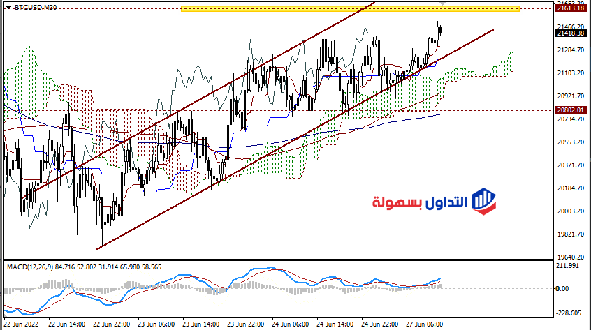 يتداول البيتكوين علي الاطار الزمني القصير في الاتجاه الصاعد وذلك خلال قناة سعرية صاعده وبالتزامن مع استمرار النطاق العرضي علي الفريم الأكبر ومن المتوقع حاليا مع استمرار التداول اسفل 21600 ان نشهد هبوط مجددا لنتمكن من كسر القناة السعرية لنصل الي 20800.