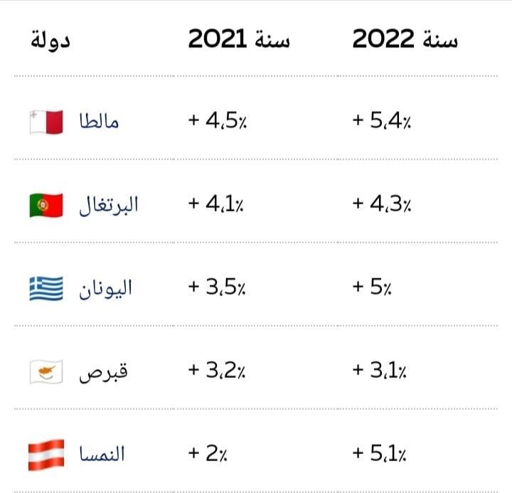 تُعتبر اليونان والبرتغال ومالطا من أكثر الدول المنتعشة في 2021 – 2022 حسب التوقعات؛ حيث قالت المفوضة الأوروبية أن الناتج المحلي الإجمالي لهذه البلاد سيزيد عن المتوسط الإقليمي، ويتسارع النمو في 2022.