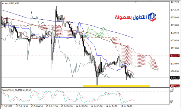 يتداول الذهب علي الاطار الزمني القصير في الاتجاه الهابط وتمكنت الأسعار خلال التداولات من محاولة الاستقرار اعلي دعم 1700 ومن المتوقع حاليا مع استمرار التداول اعلي اخر قاع حول 1697 ان نشهد صعود تصحيحي علي الأسعار لنصل الي مستوي 1715 .