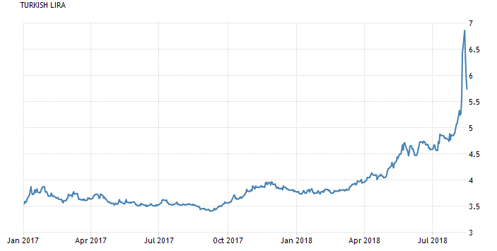 تنهار الليرة التركية مرة أخرى وتصل إلى مستوى قياسي منخفض وانخفضت الليرة التركية أكثر من 40٪ مقابل الدولار منذ يناير الماضي ، بعد أن سحقها مزيج قوي من سياسة المواجهة ، وارتباك السياسة الاقتصادية ورفع أسعار الفائدة الأمريكية أدى تصاعد الخلاف السياسي مع الولايات المتحدة إلى تغذية التقلبات وانخفاض الليرة التركية مقابل العملات الأخري.