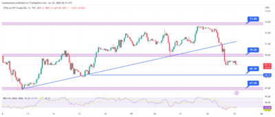 يتحرك مؤشر RSI داخل مستويات التشبع البيعي 30 مما يظهر قوة البائع ، و لذلك نتوقع استمرار الاتجاه الهابط و استهداف مستويات 68.30 ثم مستويات الدعم 67.00 دولار للبرميل الواحد .