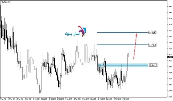 وكما ذكرنا سابقا فيعتبر مستوى 1.4608 كمستوى دعم للأسعار وتمركز لها ويستهدف الزوج مستويات 1.4739 والتي تعتبر المستهدف الأول له ومستويات 1.4818 والتي تعتبر المستهدف الثاني له وفي حالة كسرت الأسعار مستوى 1.4608 فيعتبر بذلك التحليل لاغيا ولا يعتد به .