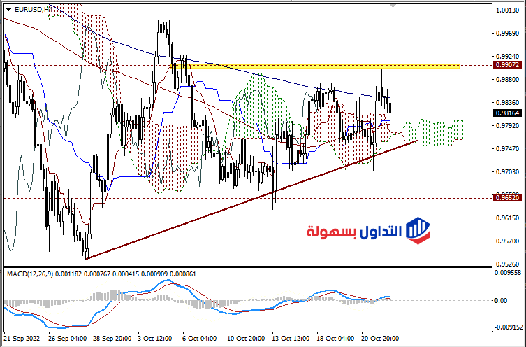 يتداول اليورو دولار علي الاطار الزمني 4 ساعات في نطاق عرضي وتمكنت الأسعار خلال التداولات من الهبوط مجددا من المقاومه ومن المتوقع حاليا مع استمرار التداول اسفل 0.9900 ان نشهد هبوط علي الأسعار لنصل الي مستوي 0.9650 .