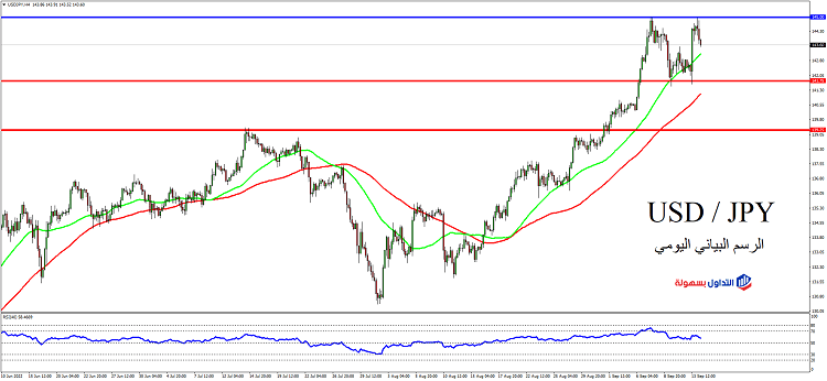 أما في المضاربات الحالية للزوج ننصح ببيع الزوج من الأسعار الحالية لتكون مستويات الدعم هي الاهداف المرتقبة، بينما يكون أمر وقف الخسارة لصفقات البيع هو ذاته شرط الدخول في صفقات شراء علي زوج (USD/JPY) وهو كسر مستوي المقاومة 145 لأعلي.
