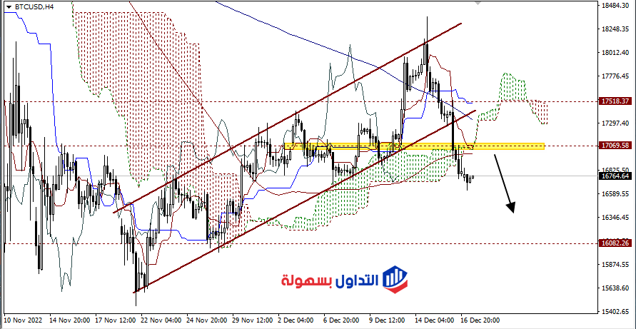 يتداول البيتكوين علي الاطار الزمني 4 ساعات في الاتجاه الهابط وذلك بعدما تمكنت الأسعار من كسر قناة سعرية صاعدة الي ان وصلت الأسعار حاليا لمناطق ارتداد ومن المتوقع بداية التصحيح حاليا لنصل حول مستويات 17000 والاغلاق السلبي حول تلك المستويات يدعم البيع مجددا علي الأسعار لنصل الي مستوي 16000.