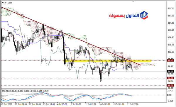 يتداول النفط علي الاطار الزمني 4 ساعات في الاتجاه الهابط وتمكنت الأسعار خلال التداولات من الهبوط مجددا بمجرد اختبار خط الاتجاه الهابط ومن المتوقع حاليا مع استمرار التداول اسفل 99.00 ان نشهد مزيد من التراجع لنصل الي مستوي 92.00 يليه 89.00 .