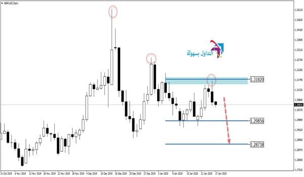 وكما ذكرنا سابقا فيعتبر مستوى 1.3182 كمستوى مقاومة للأسعار وتمركز لها ويستهدف الزوج مستويات 1.2985 والتي تعتبر المستهدف الأول له ومستويات 1.2873 والتي تعتبر المستهدف الثاني له وفي حالة كسرت الأسعار مستوى 1.3182 فيعتبر بذلك التحليل لاغيا ولا يعتد به .