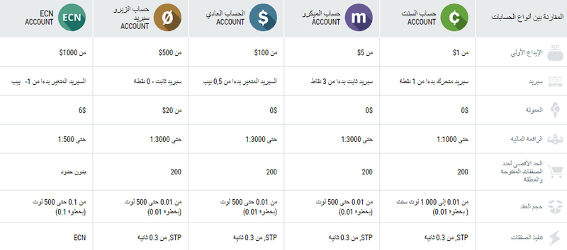 فيما يلي سبريد فوركس لحسابات المختلفة :